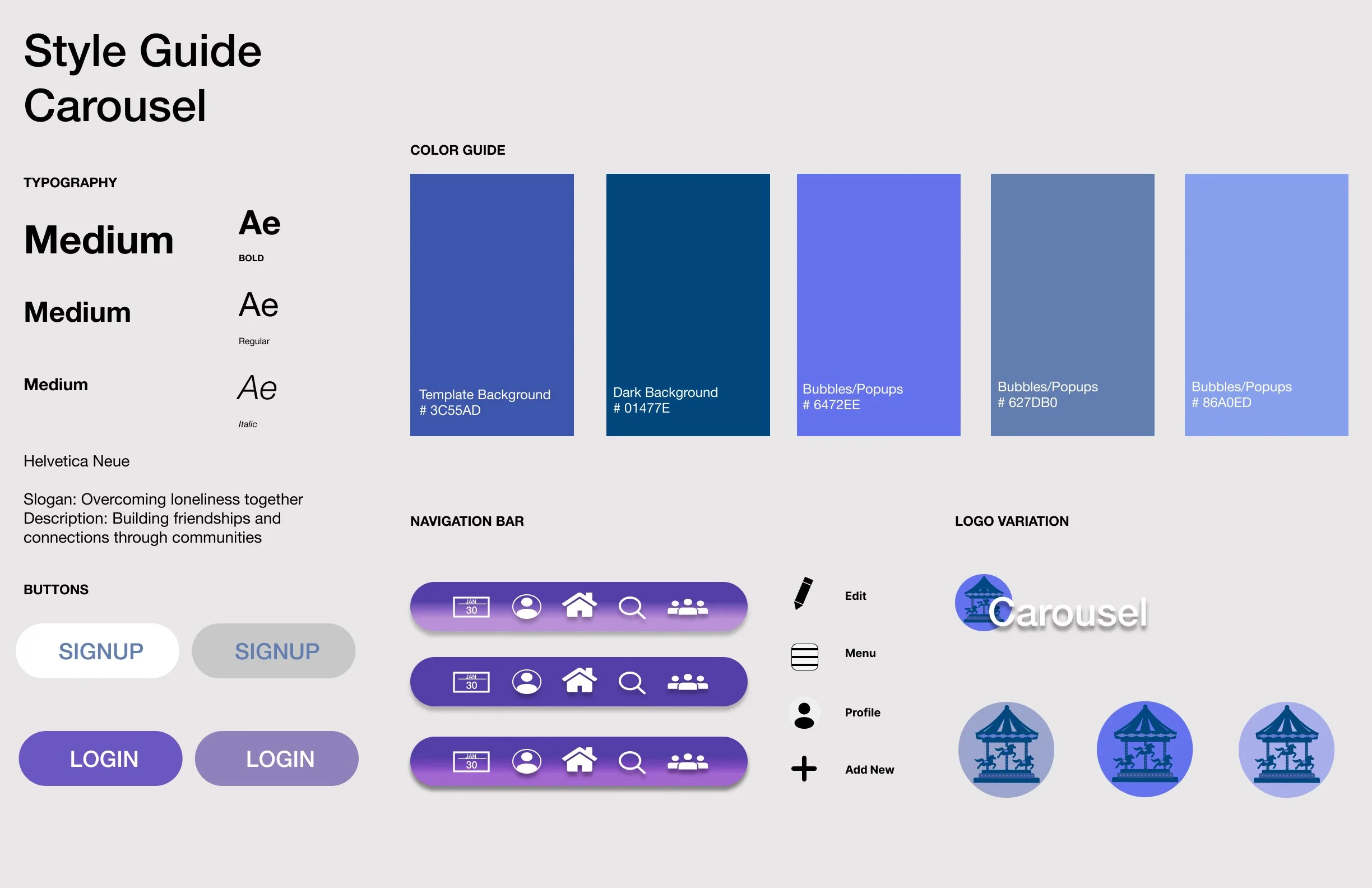 The style guide for this app focused on transitions of colors. The theme surrounded cool tone colors, transitioning between purples, blues, and navy. Choosing this UI for the app was very important to me, I wanted the colors to speak to a user and make them feel as if they were riding a carousel underneath the night sky. I incorporated touches of white throughout the app to break the cool tones with a touch of warmness. Carousel is an app that is inviting, fun and cheerful, it imitates our childhood when we had no worries and the UI of the app help get that message across. Allowing for users to feel hopeful in their journey to build and form new connections, overcoming loneliness.