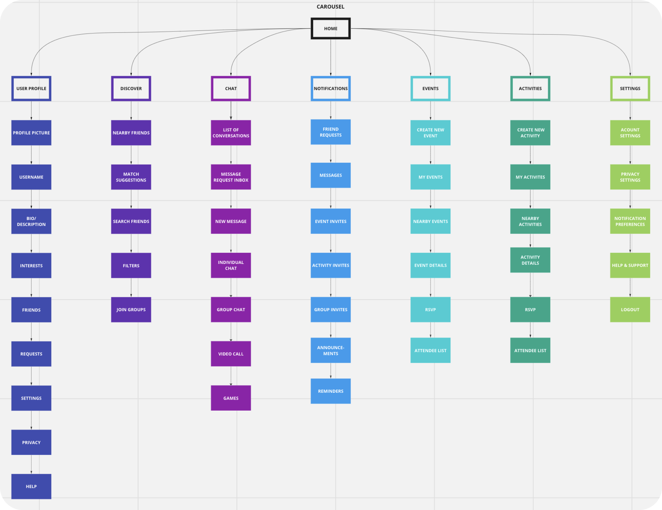 Then, I went into Miro and created a high fidelity site map. I was able to organize, add color and enhance readability. At this stage I could see the app coming to life.