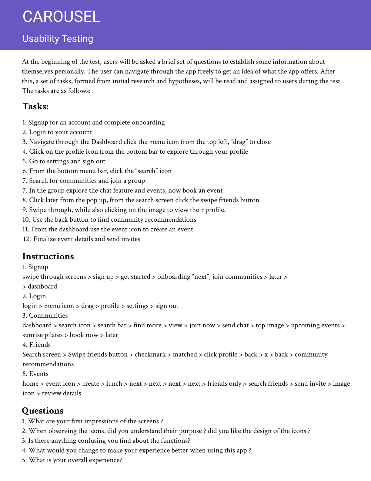 Carousel completed 2 rounds of usability testing. These were the tasks and questions that were asked.